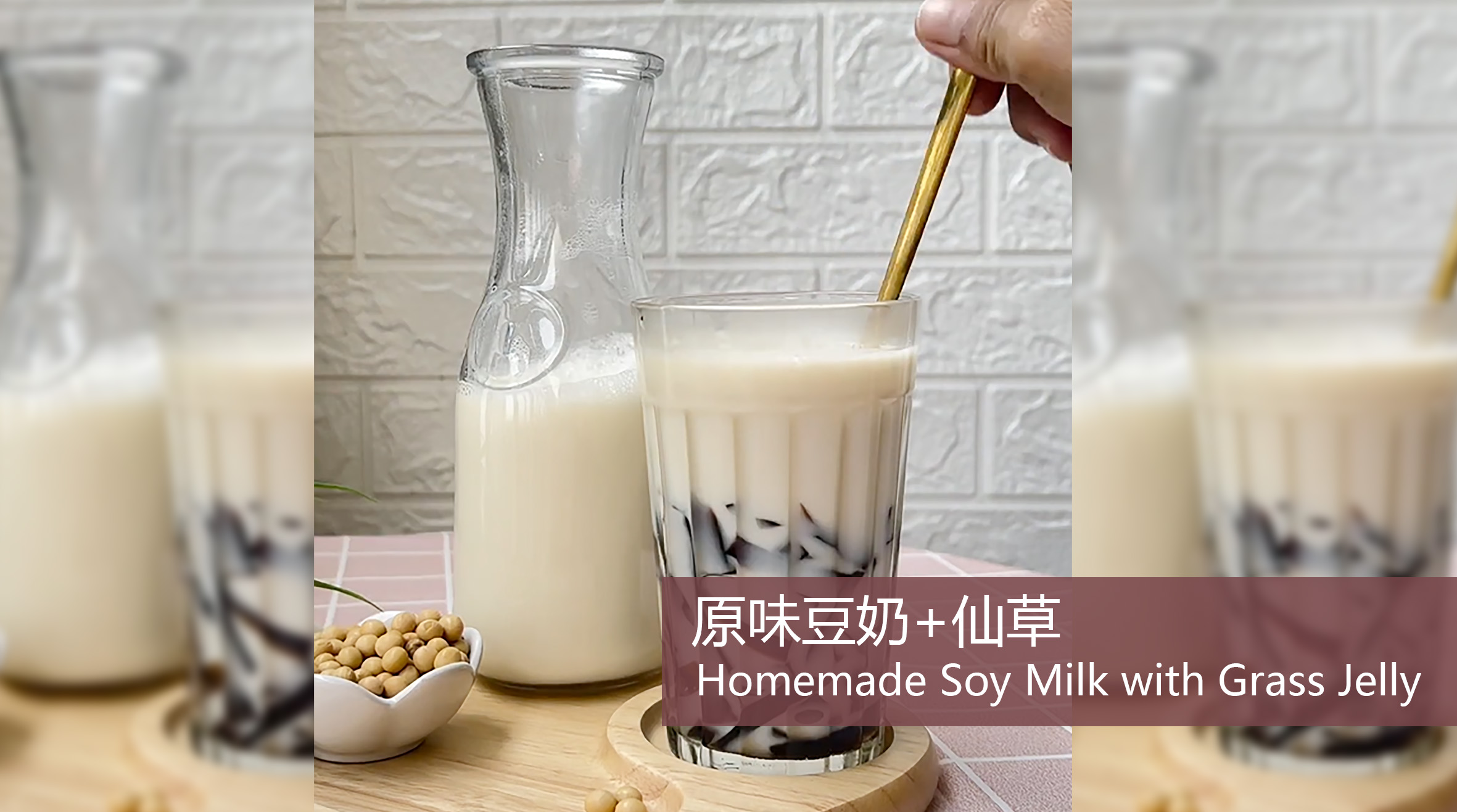 3.Cut the grass jelly into small pieces or strips, place them in a glass, and then pour in the freshly blended soy milk. Enjoy it either cold or hot!